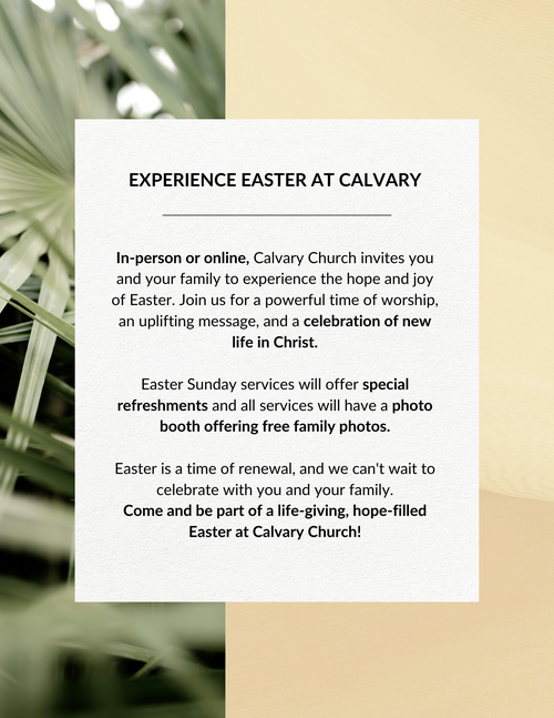 Experience the hope and renewal of Easter at Calvary Church! This special day marks the resurrection of Jesus and the promise of new life. Join us for a celebration filled with uplifting worship, inspiring messages, and the warmth of a community united in joy.